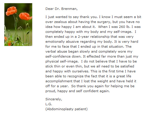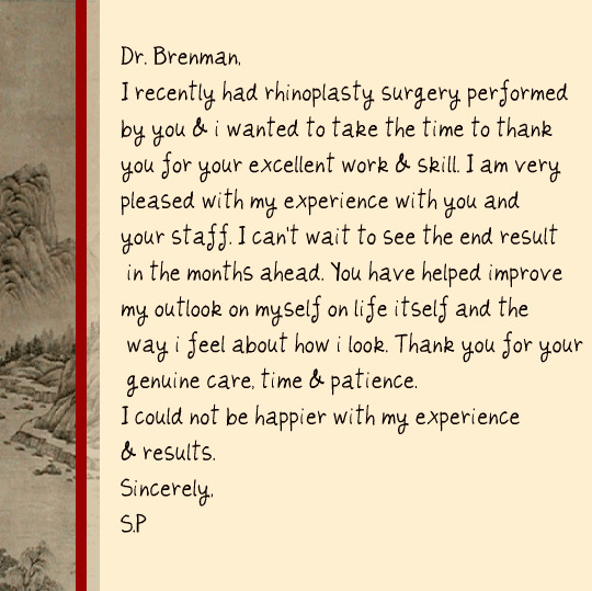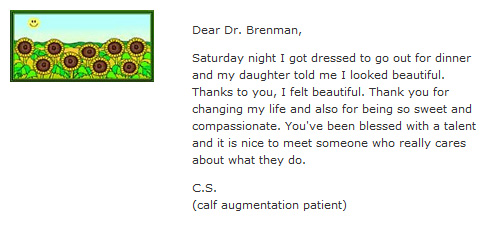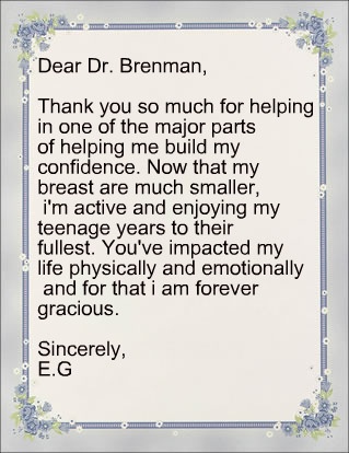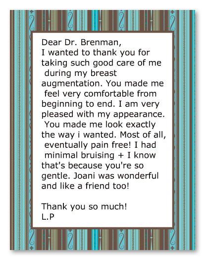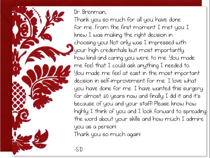 Dr. Brenman and his staff have been completely supportive and professional through out my whole procedure and follow up appointments. Everyone has been so polite and helpful. I am very grateful to have had my surgery with this staff and highly recommend them to anyone who is looking to have plastic surgery. I am thrilled with my results and the compliments I have been receiving I owe to all of you. Thank You so much for making such a wonderful impact on my life. I am forever grateful to all of you and your professionalism and dedication to your patients.*