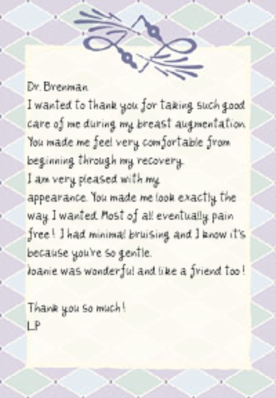 I would like to start off by saying “Thank You!” I am very happy with Dr Brenman, his work & his staff. I did my homework and interviewed many plastic surgeons prior to my own procedure (Breast Augmentation). I was most impressed with Dr Brenman because of his ability to communicate with me and explain the procedure and also his ability to make you very comfortable during the entire the pro process. I have proudly and highly recommended Dr. Brenman to friends and family.*